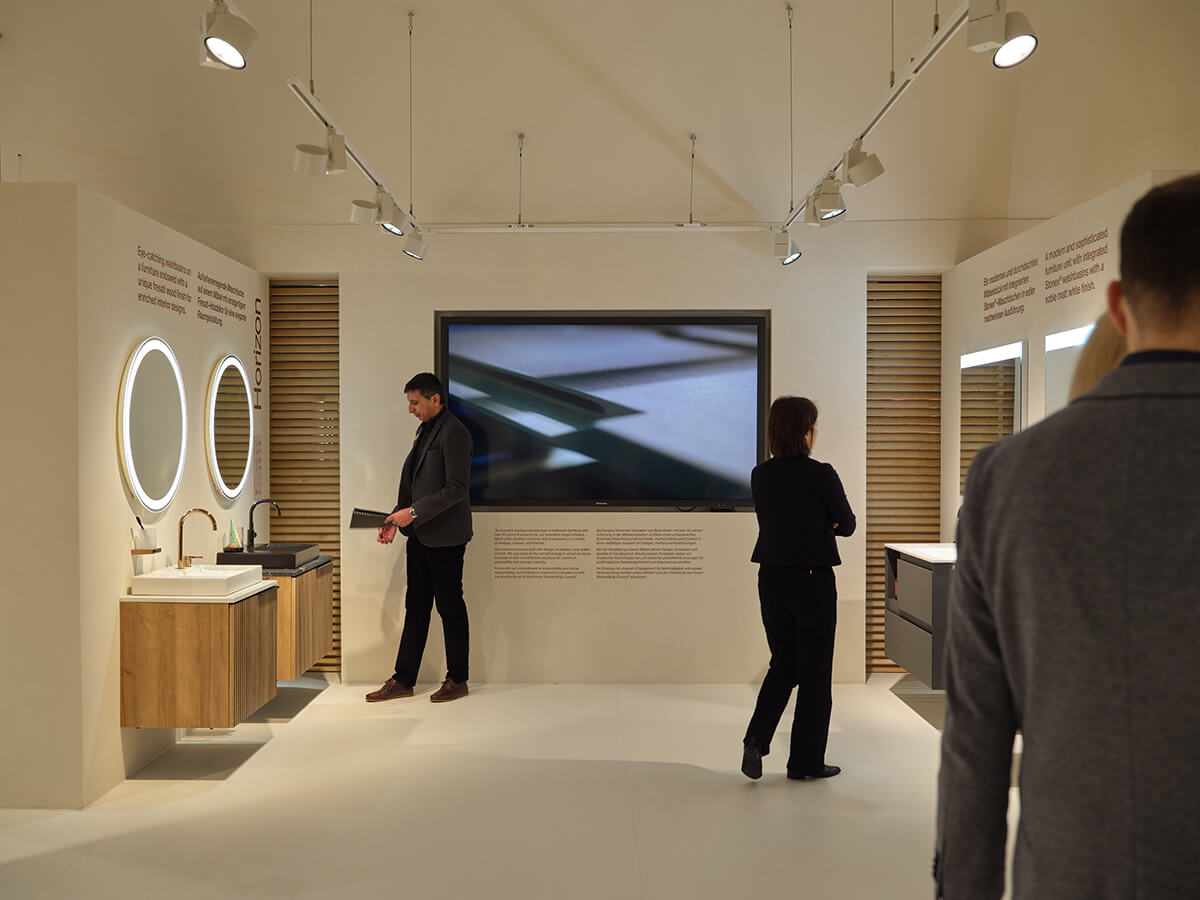 Mesura se ha inspirado en el trabajo de algunos de los grandes arquitectos de la Barcelona de mitad del siglo XX y en su forma de utilizar la luz y los materiales más sencillos para lograr gestos arquitectónicos poderosos. Las nuevas colecciones e innovaciones de Roca se exponen en torno a un patio central, que recuerda a la típica "plaza", donde los visitantes pueden reunirse e interactuar. Las contraventanas, también esenciales en la arquitectura mediterránea, desempeñan un papel importante en el diseño del stand. Dispuestas de tal manera que desde el exterior permiten vislumbrar el producto albergado en el stand, estas contraventanas crean un ambiente íntimo en el interior en el que destaca el juego de luces generado.